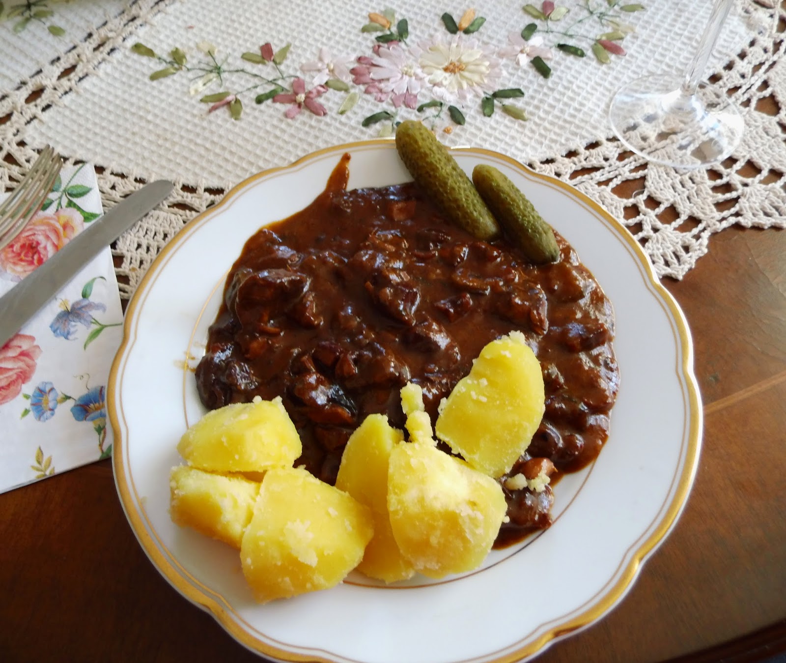Außer Pfeffer und Salz kamen noch Tomatenmark hinzu und Scheiben von eingelegten Gurken, sowie Paprikapulver, Piment, Lorbeerblätter und gehackter Thymian mit Rosmarin. Letzteres wurde selbstredend nicht gebraten, sondern mittendrin hatte ich alles abgelöscht mit Rotwein und Gemüsebrühe. Das kochte dann 1 ½ Stunden vor sich. Am Ende kamen noch Mehl und saure Sahne hinein und fertig war die Pampe. Ich fand sie ganz nett.