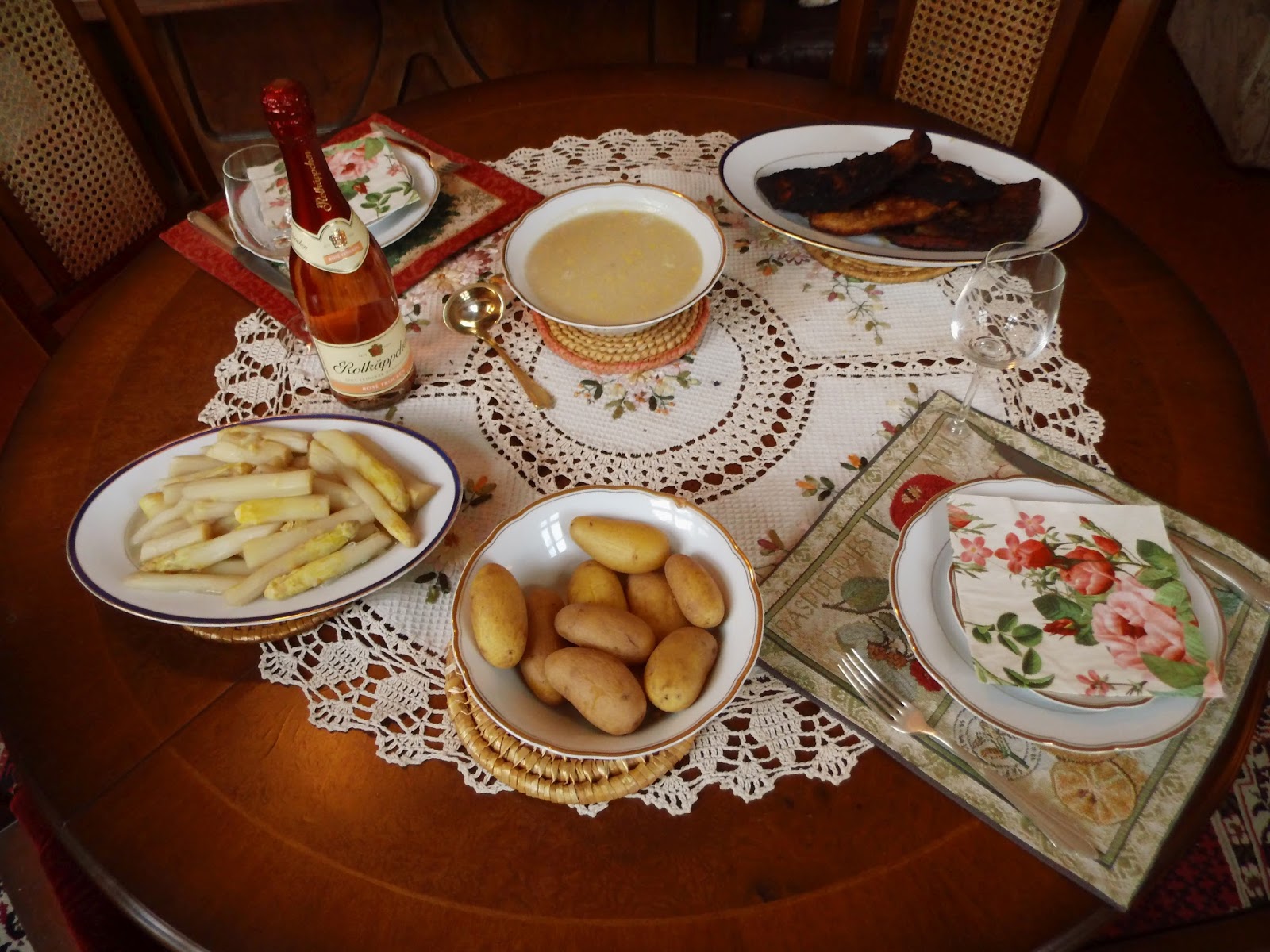Und hier 2 Bilder von dem, was es am Sonntag geben sollte. Ich hatte es auf den Montag verschoben, aber das wurde dann ein recht seltsamer Tag. Was man sieht, ist Putenbrust, wie ein Schnitzel traktiert, also mit Panade etc. Der Spargel war ebenfalls eßbar.