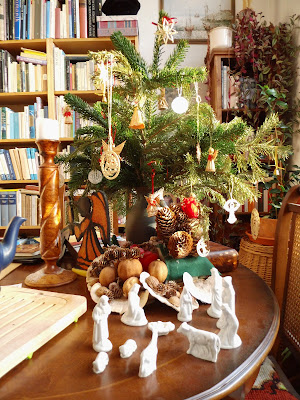 Ich muß gestehen, es ist mir in diesem Jahr etwas schwergefallen, die Weihnachtsdekoration wegzuräumen, so bescheiden sie war. Sie bestand eigentlich nur aus diversen transparenten Sternen an den Fenstern, einem leuchtenden davor und dem kleinen Aufbau auf dem Tisch, den man nachfolgend noch sehen kann.